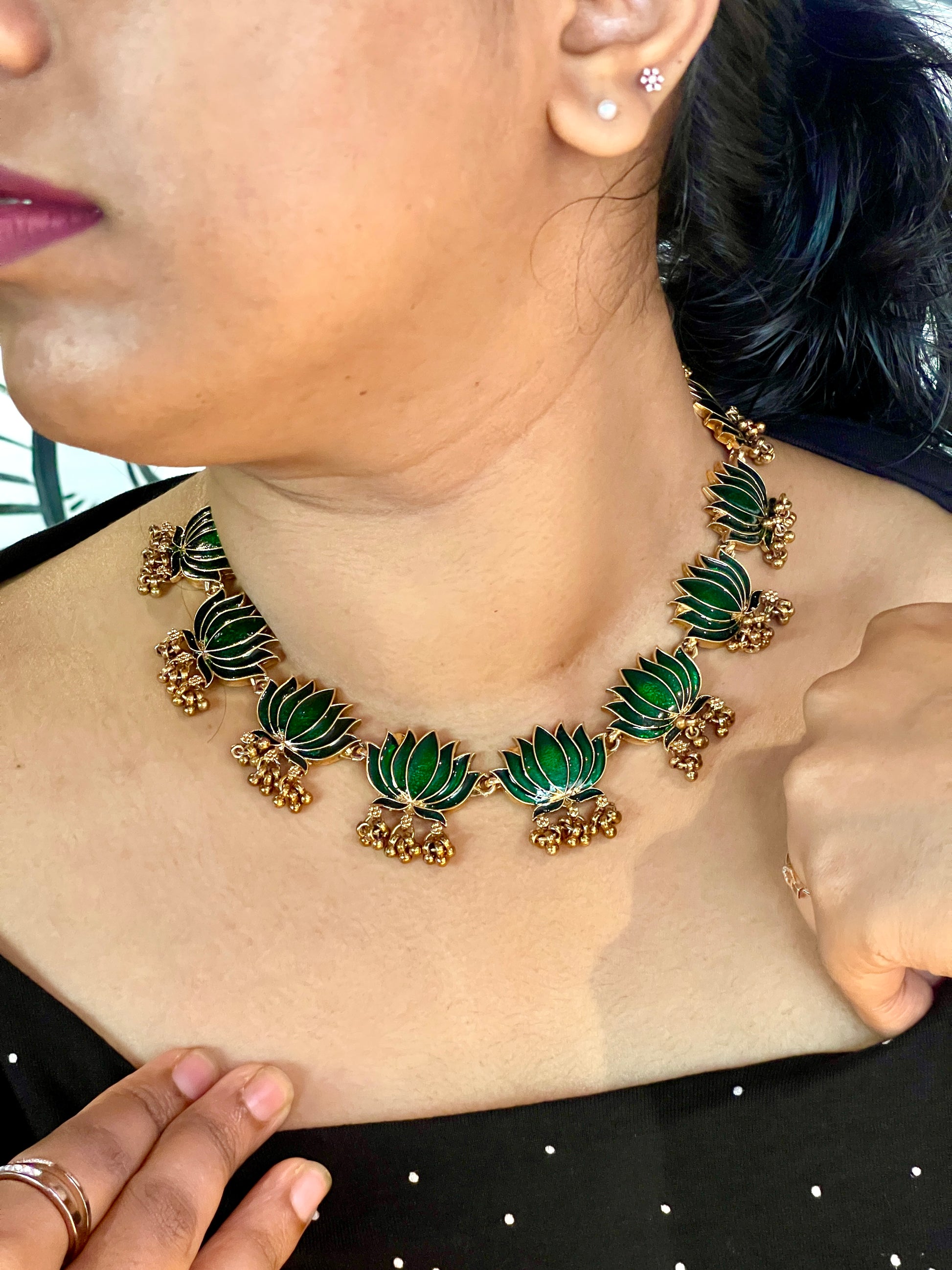 Elevate your festive ensemble with the Tamarai - Lotus Necklace, a masterpiece inspired by the timeless beauty of the lotus flower. This traditional jewelry piece embodies cultural elegance, making it an ideal choice for special occasions. Expertly crafted to highlight intricate lotus motifs, it offers a sophisticated yet classic appeal that complements traditional attire and enhances your overall look. Perfect for celebrations, this necklace merges heritage artistry with refined design, adding a graceful touch to your festive wardrobe.