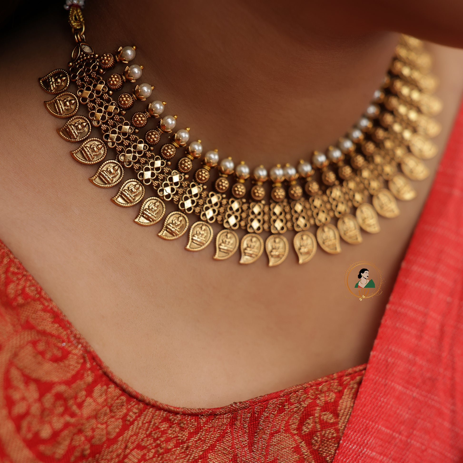 The Traditional Antique Mango Necklace Set features intricately crafted mango motifs, symbolizing prosperity and beauty in Indian culture. With its antique gold finish and classic design, it exudes timeless elegance. Ideal for weddings and festive occasions, this set adds a regal, heritage charm to any traditional ensemble or ethnic attire.