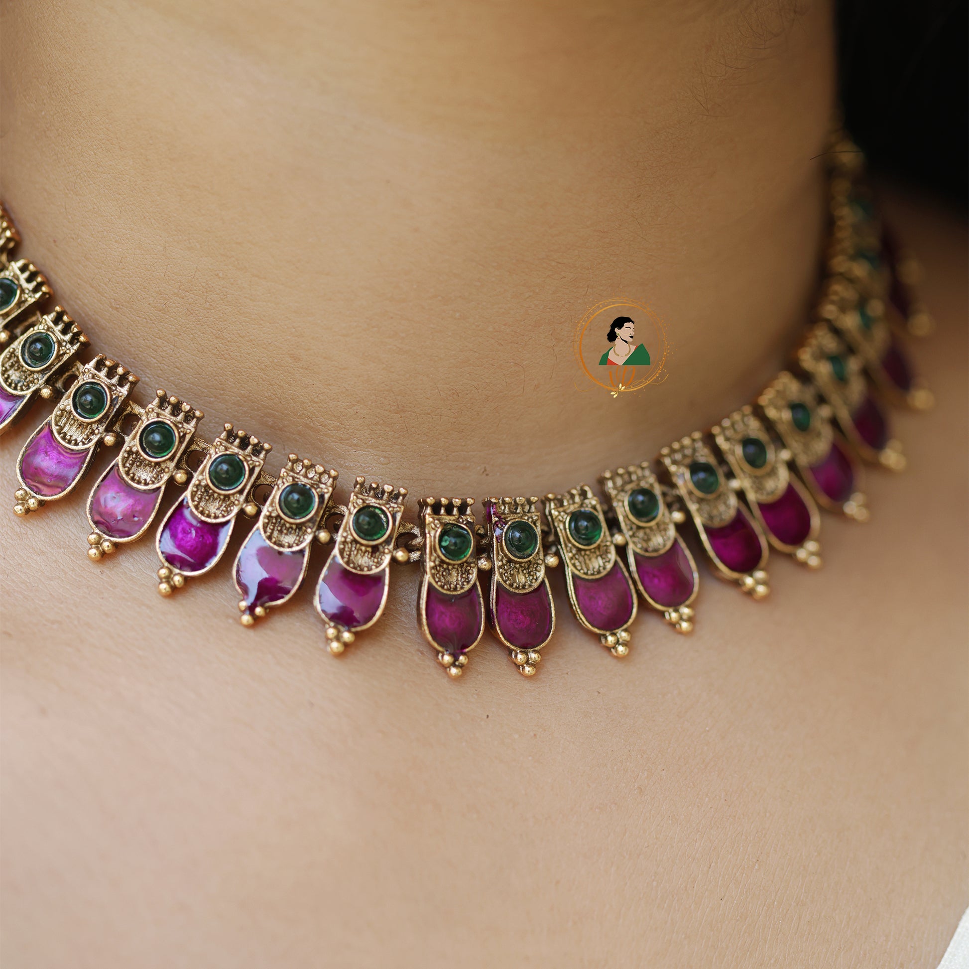 The Vadamulla Choker features a sophisticated purple design that lends a regal touch to your ensemble. . Its rich hue and precise craftsmanship make it an essential piece for those seeking understated luxury in their jewelry collection.